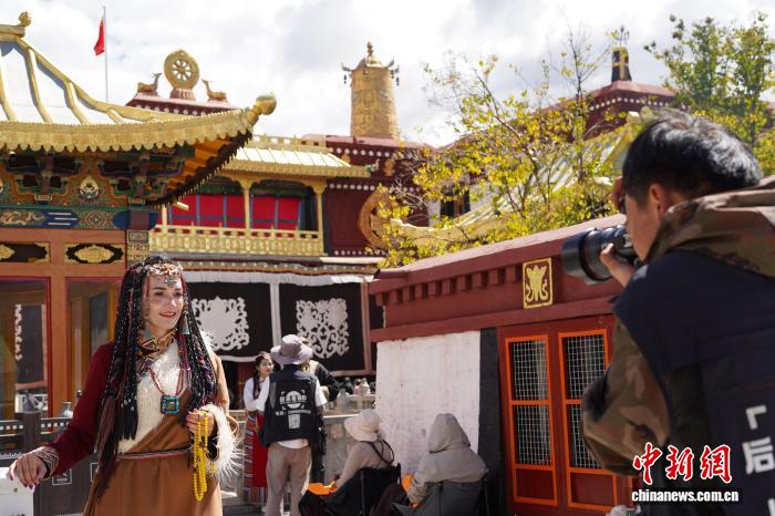 9月28日,西藏拉薩大昭寺、八廓街,來自意大利、烏克蘭、墨西哥等國的游客,身著色彩艷麗的藏族傳統(tǒng)服飾,在金頂紅墻的映襯下拍照留念。圖為來自意大利的游客身著藏裝在大昭寺廣場(chǎng)拍照留念。中新社記者 貢嘎來松 攝