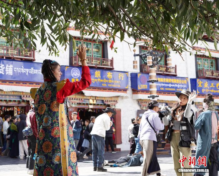 圖為來自意大利的游客身著藏裝在大昭寺廣場(chǎng)拍照留念。中新社記者 貢嘎來松 攝