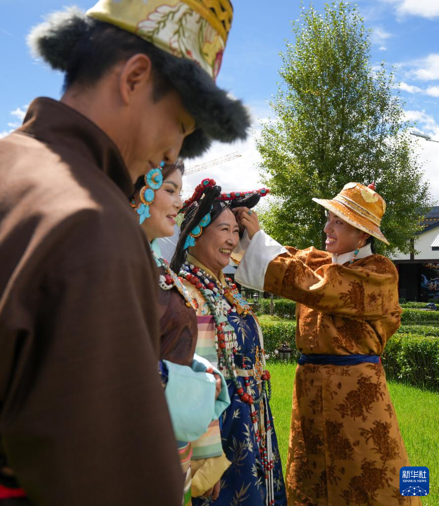 班珠丹塔(右一)在為模特調(diào)整藏裝配飾(9月9日攝)。新華社記者 晉美多吉 攝