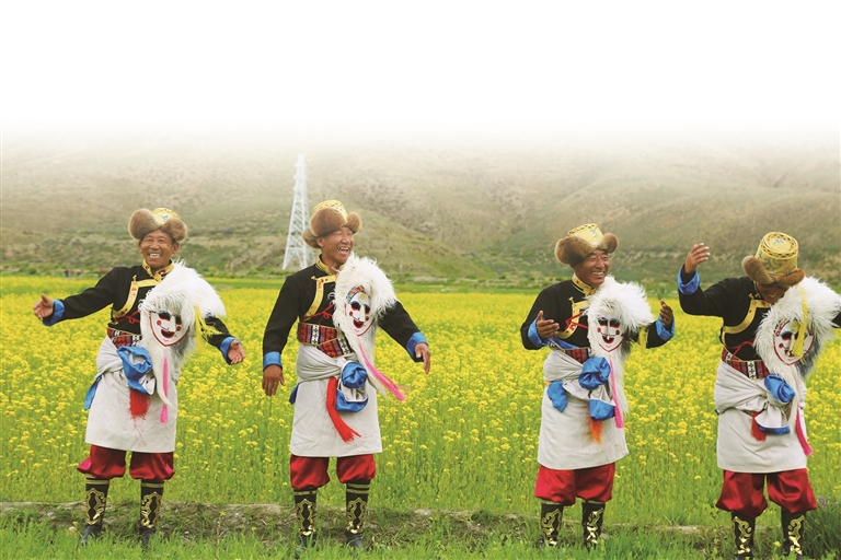 農(nóng)牧民在油菜花田中歡快舞蹈。