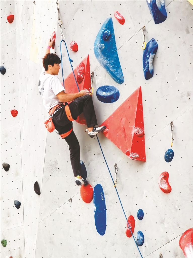 在攀巖場(chǎng)館,攀巖運(yùn)動(dòng)員正在訓(xùn)練中。記者 洛桑 攝