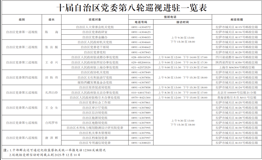 根據(jù)自治區(qū)黨委關(guān)于巡視工作的統(tǒng)一部署,截至10月24日,十屆自治區(qū)黨委第八輪巡視完成進(jìn)駐工作。自治區(qū)黨委巡視組將對(duì)自治區(qū)人大常委會(huì)機(jī)關(guān)、政府機(jī)關(guān)、政協(xié)機(jī)關(guān),自治區(qū)黨委社會(huì)工作部、政研室、金融辦、老干部局、機(jī)關(guān)事務(wù)管理局、黨校,自治區(qū)審計(jì)廳、信訪局、能源局、投資促進(jìn)局、地勘局、檔案館、專用通信局、水利電力規(guī)劃勘測(cè)設(shè)計(jì)研究院,自治區(qū)人民政府駐北京辦事處、駐成都辦事處、駐西安辦事處、駐上海辦事處、駐格爾木辦事處,援助西藏發(fā)展基金會(huì)等23個(gè)區(qū)直單位黨組織開展常規(guī)巡視;對(duì)自治區(qū)文化和旅游廳黨組開展巡視“回頭看”。