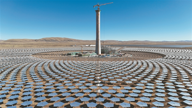 記者在施工現(xiàn)場了解到,該吸熱塔配置近1.6萬臺(tái)定日鏡,總采光面積超80萬平方米,工人正在緊張有序安裝,計(jì)劃于明年3月搭建完畢,塔頂吸熱器擬于明年4月安裝完成。屆時(shí)一座座五邊形的定日鏡,就像草原上的一朵朵“向日葵”,實(shí)時(shí)追蹤太陽位置,將陽光反射至中央吸熱塔,呈現(xiàn)“萬鏡朝陽、塔耀雪山”的壯麗景象,如同科幻電影里的場景,成為藏北高原上一座“亮眼”的綠色能源地標(biāo)。