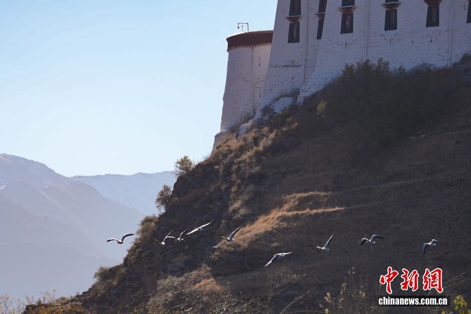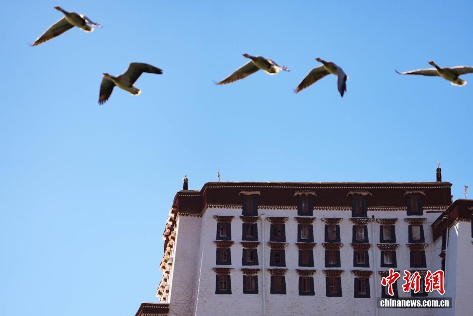 11月17日,西藏拉薩迎來大批越冬候鳥。拉薩河、宗角祿康公園等地,成為了它們的棲息天堂。在宗角祿康公園內(nèi),赤麻鴨、斑頭雁成群結隊,時而低頭覓食,時而水中嬉戲。它們的身影引得市民和游客紛紛駐足觀賞、拍照留念,構成了一幅人與自然和諧共生的美麗畫卷。圖為斑頭雁與布達拉宮同框。貢確 攝