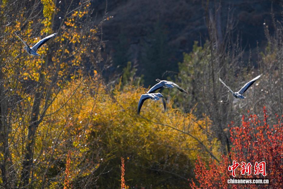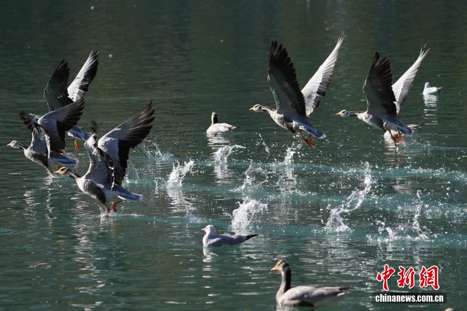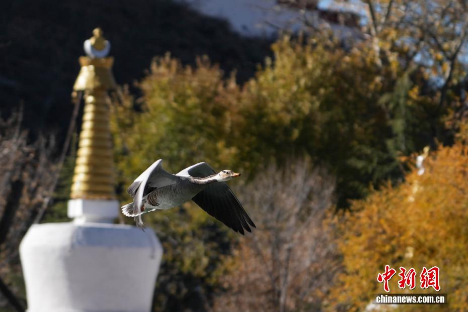 11月17日,西藏拉薩迎來大批越冬候鳥。拉薩河、宗角祿康公園等地,成為了它們的棲息天堂。在宗角祿康公園內(nèi),赤麻鴨、斑頭雁成群結隊,時而低頭覓食,時而水中嬉戲。它們的身影引得市民和游客紛紛駐足觀賞、拍照留念,構成了一幅人與自然和諧共生的美麗畫卷。圖為斑頭雁從宗角祿康公園上方飛過。貢確 攝