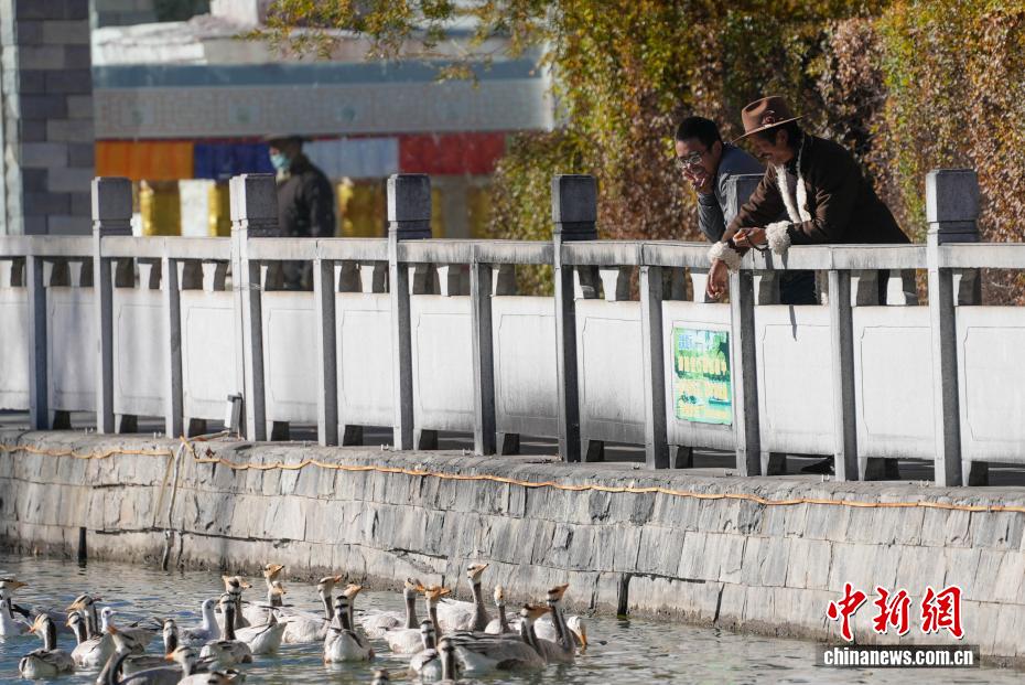 11月17日,西藏拉薩迎來大批越冬候鳥。拉薩河、宗角祿康公園等地,成為了它們的棲息天堂。在宗角祿康公園內(nèi),赤麻鴨、斑頭雁成群結隊,時而低頭覓食,時而水中嬉戲。它們的身影引得市民和游客紛紛駐足觀賞、拍照留念,構成了一幅人與自然和諧共生的美麗畫卷。圖為市民在宗角祿康公園內(nèi)投喂候鳥。貢確 攝
