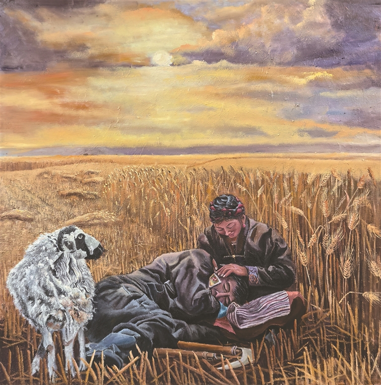 “《牧歸》是我的第一幅油畫作品,描繪的是牧民春耕回家的場(chǎng)景?!编u文江指著畫室一角已經(jīng)完成的作品說(shuō)道。畫面上,夕陽(yáng)余暉中,牧民背著傳統(tǒng)農(nóng)具趕著牦牛緩緩歸來(lái),遠(yuǎn)處炊煙裊裊,濃郁的生活氣息撲面而來(lái)。