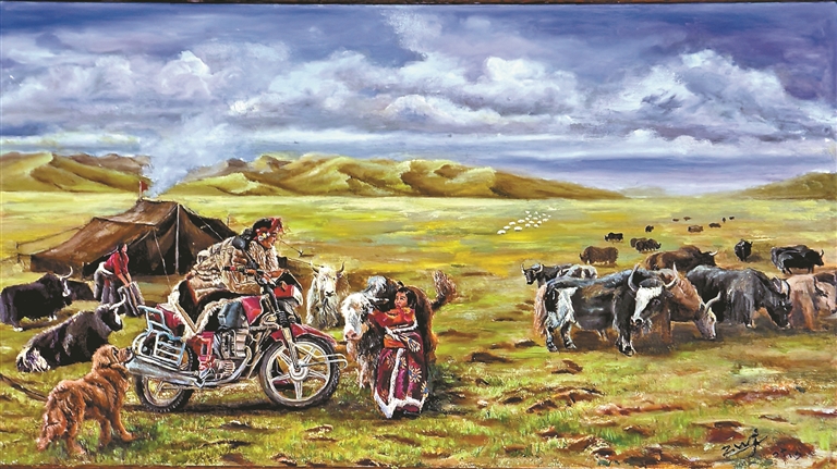 在鄒文江的畫筆下,《草原新景》展現(xiàn)的是牧民騎著摩托車放牧,藍(lán)天白云下,現(xiàn)代化的交通工具與遠(yuǎn)處的雪山相映成趣;《記憶——紀(jì)念修建川藏公路》描繪的是十八軍戰(zhàn)士修建川藏公路時(shí)的險(xiǎn)峻場(chǎng)景,崇山峻嶺間,奔騰不息的怒江咆哮而過(guò),正在修路的十八軍戰(zhàn)士顯得渺小又偉大;《邊陲人家》記錄的是一戶邊境牧民家庭悠閑放牧的生活場(chǎng)景……他的作品中,既有圣潔的雪山、遼闊的草原、成群的牦牛,也有現(xiàn)代化的學(xué)校、醫(yī)院、民居和牧民的笑容。