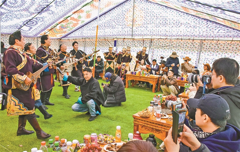 “我們的烤藏香豬外皮酥脆、肉質(zhì)鮮嫩,來嘗嘗吧?!薄笆侂u、石鍋雞,先喝湯、再吃雞。”“青稞酥油茶,免費品嘗啦?!薄げ夹履甑目鞓穭艃涸谟谶@一聲聲吆喝聲中,在于熱鬧的氛圍,在于每一個人滿足的笑臉。