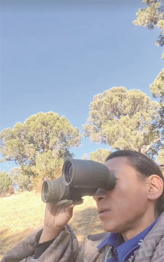 次仁桑珠用望眼鏡觀察山林狀況。