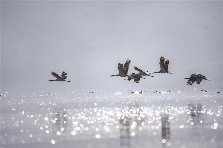 來到卡孜水庫,只見水面上薄霧未散,黑頸鶴的鳴叫聲劃破靜謐,那聲音清亮卻不刺耳,像帶著高原特有的通透感,時(shí)而短促清脆伴著水波蕩漾的輕響,似乎在訴說著高原的故事。循聲望去,幾只黑頸鶴正在湖面上悠然佇立,修長的脖頸微微彎曲,倒映在平靜的水面上,宛如水墨畫卷中的靈動(dòng)筆觸;忽然間,幾只黑頸鶴率先舒展雙翼,寬大的翅膀劃破晨霧,腳掌蹬離水面時(shí)濺起細(xì)碎的水花,身姿矯健地朝著高空飛去,其余黑頸鶴也相繼展翅,追隨同伴的身影扶搖而上,朝著村落方向飛去。當(dāng)它們從錯(cuò)落有致的村民住房上空掠過時(shí),晨光恰好穿透薄霧,灑在灰褐色的羽翼上,下方屋頂升起裊裊炊煙,動(dòng)靜之間,勾勒出一幅人與自然和諧共生的鮮活圖景。