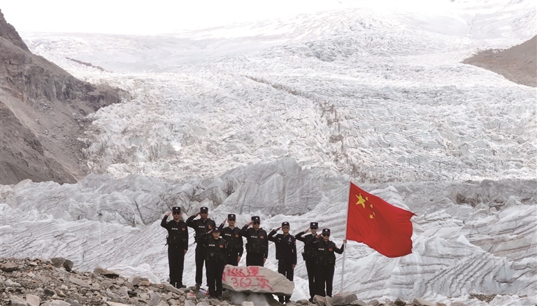 普瑪江塘邊境派出所民警開(kāi)展冰川巡邏。 徐道超 攝圖由山南邊境管理支隊(duì)提供