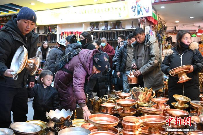 2月9日,隨著春節(jié)、藏歷新年臨近,西藏拉薩市八廓商城等年貨市場人頭攢動。市民忙著挑選酥油花、香布、切瑪盒等傳統(tǒng)年貨,市場內(nèi)購銷兩旺、喜慶熱鬧,古城拉薩處處洋溢著濃厚的節(jié)日氛圍。