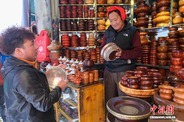 2月13日,拉薩年貨市場,來自昌都市芒康縣的康巴漢子阿旺次仁(右)為顧客挑選藏式木碗。中新社記者 江飛波 攝