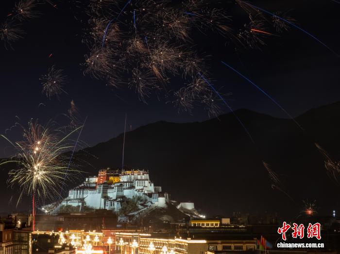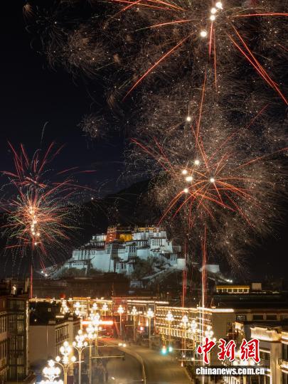 圖為2月16日晚,拉薩北京東路煙花綻放與遠(yuǎn)處的布達(dá)拉宮交相輝映。中新社記者 江飛波 攝
