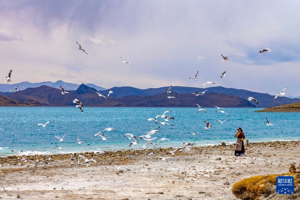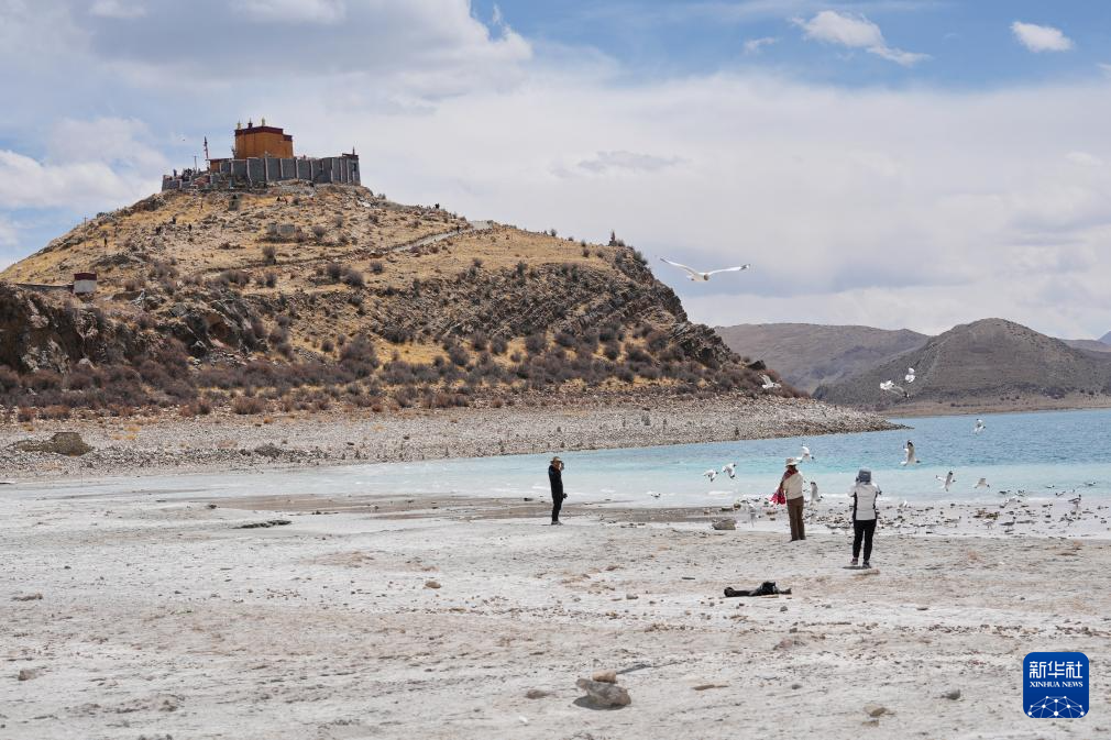 游客在羊卓雍錯北岸的日托寺附近投喂棕頭鷗(4月5日攝)。新華社記者 張汝鋒 攝