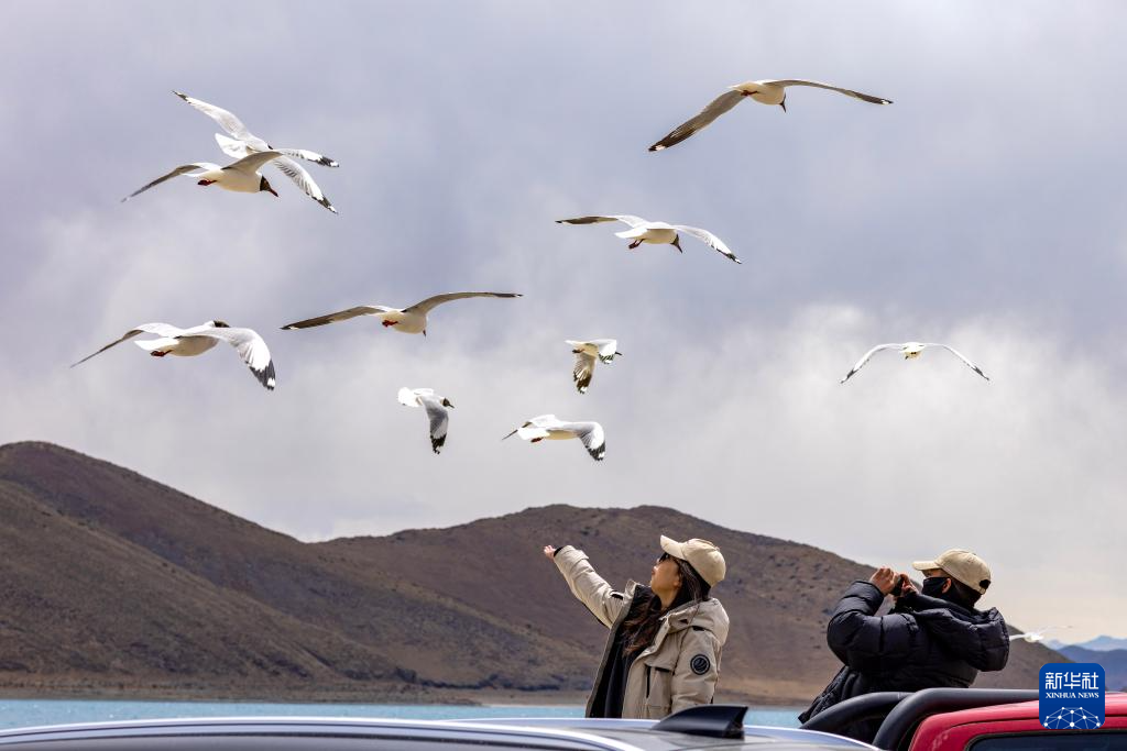 游客在羊卓雍錯岸邊投喂棕頭鷗(4月5日攝)。新華社記者 姜帆 攝