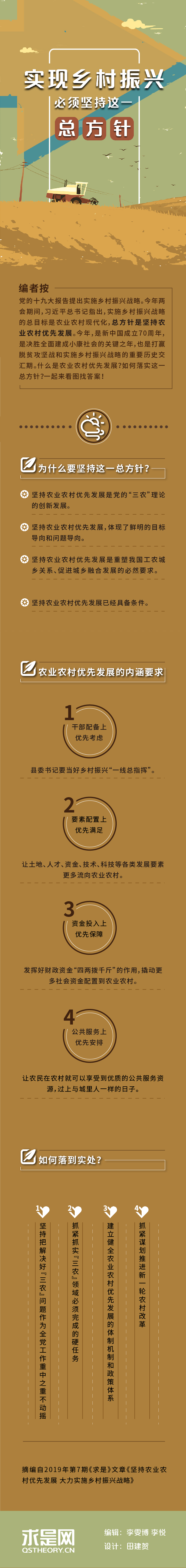 編者按:黨的十九大報(bào)告提出實(shí)施鄉(xiāng)村振興戰(zhàn)略。今年兩會期間,習(xí)近平總書記指出,實(shí)施鄉(xiāng)村振興戰(zhàn)略的總目標(biāo)是農(nóng)業(yè)農(nóng)村現(xiàn)代化,總方針是堅(jiān)持農(nóng)業(yè)農(nóng)村優(yōu)先發(fā)展。今年,是新中國成立70周年,是決勝全面建成小康社會的關(guān)鍵之年,也是打贏脫貧攻堅(jiān)戰(zhàn)和實(shí)施鄉(xiāng)村振興戰(zhàn)略的重要?dú)v史交匯期。什么是農(nóng)業(yè)農(nóng)村優(yōu)先發(fā)展?如何落實(shí)這一總方針?一起來看圖找答案!