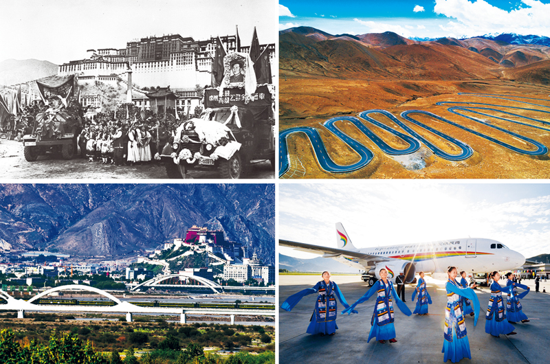 民族區(qū)域自治制度在西藏的偉大實(shí)踐,使西藏實(shí)現(xiàn)了經(jīng)濟(jì)社會(huì)發(fā)展短短幾十年、跨越上千年的歷史性巨變。左上圖:1954年12月25日,川藏、青藏兩條公路勝利通車到拉薩,在布達(dá)拉宮廣場上舉行盛大通車儀式(資料照片)。左下圖:2016年6月27日,青藏鐵路列車經(jīng)過拉薩(新華社記者 普布扎西/攝)。右上圖:2017年5月19日,通往珠峰的公路(新華社記者 普布扎西/攝)。右下圖:2011年7月26日,西藏航空有限公司正式開航(新華社記者 覺果/攝)。