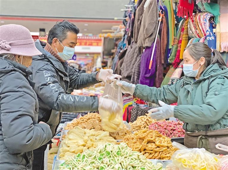 漫步八廓商城,從一樓到三樓,攤位整齊有序。風(fēng)干的牛羊肉、色彩斑斕的“卡賽”醉人的青稞酒……從節(jié)日用品、服裝飾品到干果零食,各式各樣的年貨琳瑯滿目。