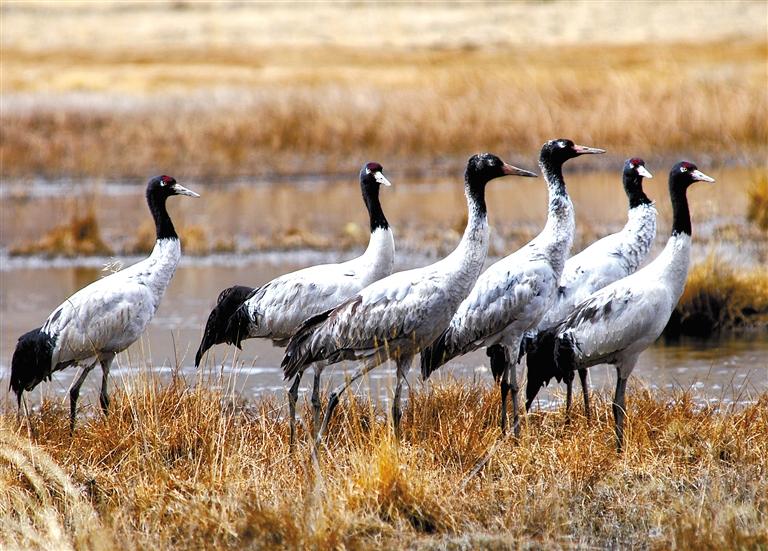 林周縣卡孜水庫(kù)附近覓食的黑頸鶴?! ?/p>