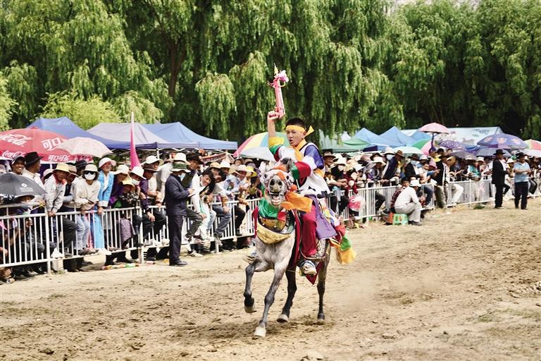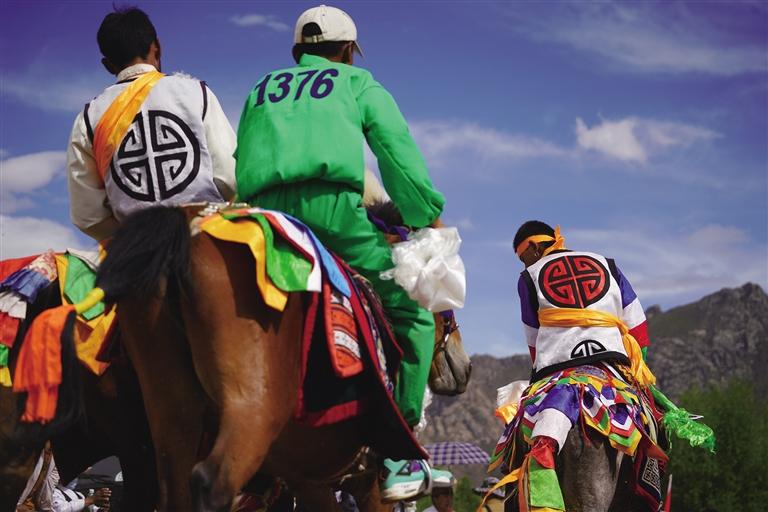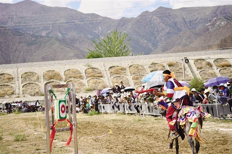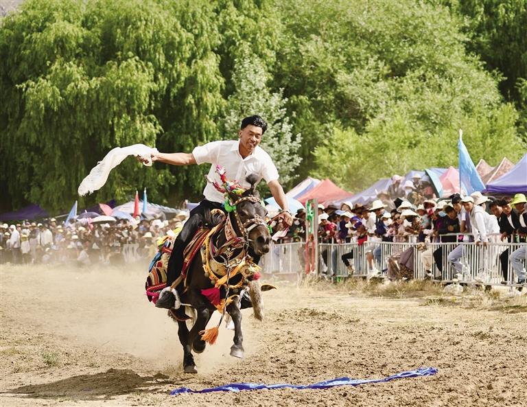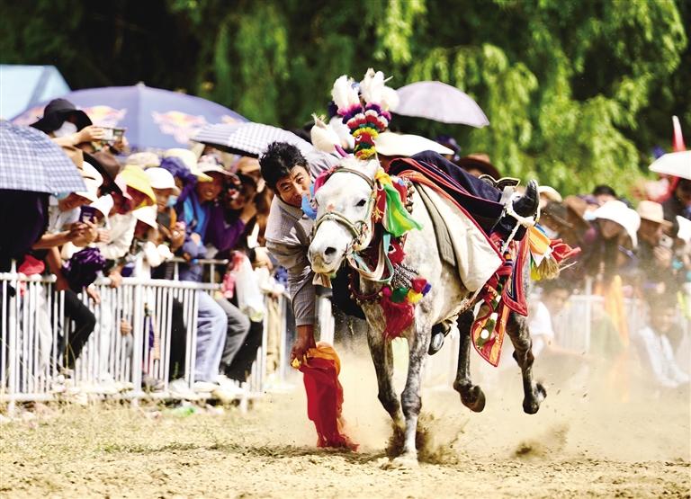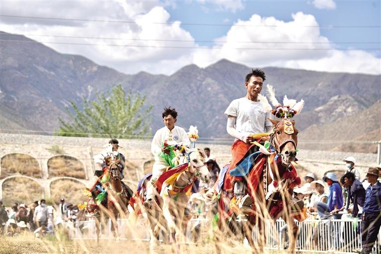 當(dāng)日上午11時(shí),茶巴朗村望果節(jié)賽馬正式開始,騎手們身著傳統(tǒng)服飾,戴著紅纓帽,身背彎弓,騎著打扮華麗的駿馬,進(jìn)行了4000米速度賽馬、拾哈達(dá)、射箭、馬術(shù)等精彩比賽。現(xiàn)場(chǎng),觀眾揮舞手臂為選手們鼓勁吶喊。馳騁在賽場(chǎng)上,選手的吆喝聲伴著觀眾的吶喊聲在賽場(chǎng)上空匯聚。