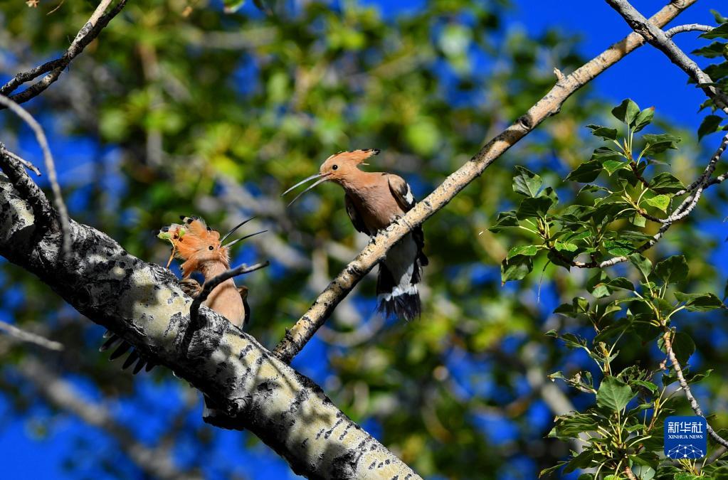 8月25日,兩只戴勝在樹上嬉戲。新華社記者 張汝鋒 攝
