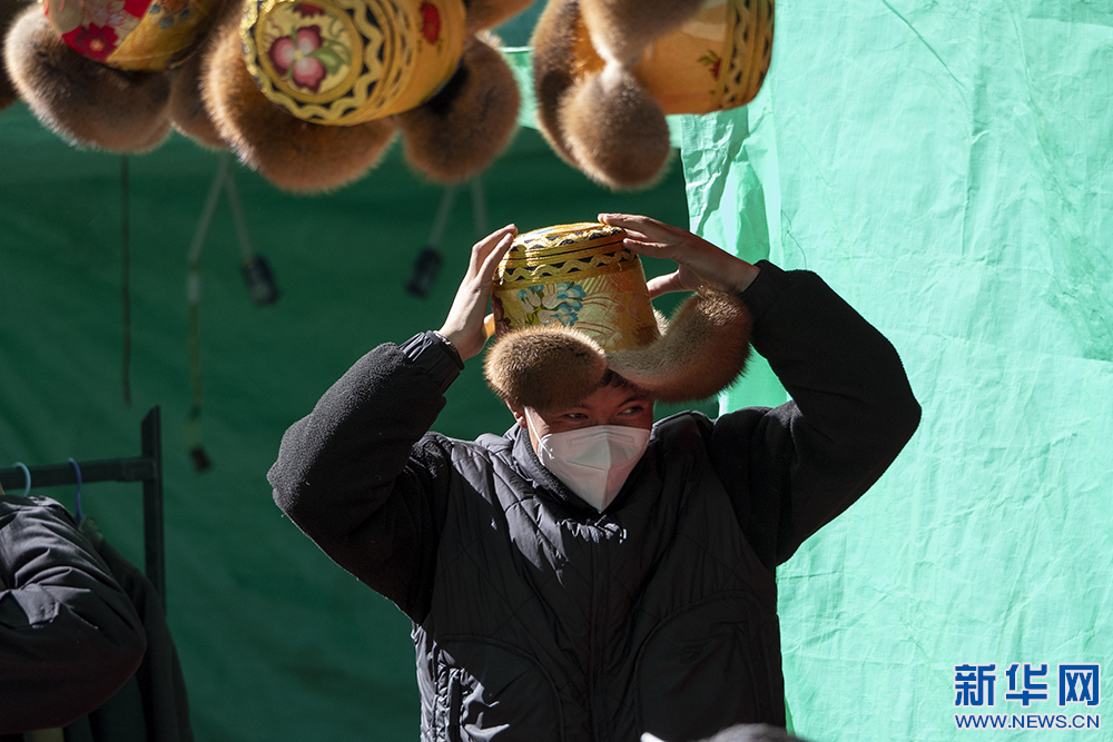 12月3日,顧客在物交會上試戴傳統(tǒng)金絲藏帽。新華網(wǎng) 旦增努布 攝
