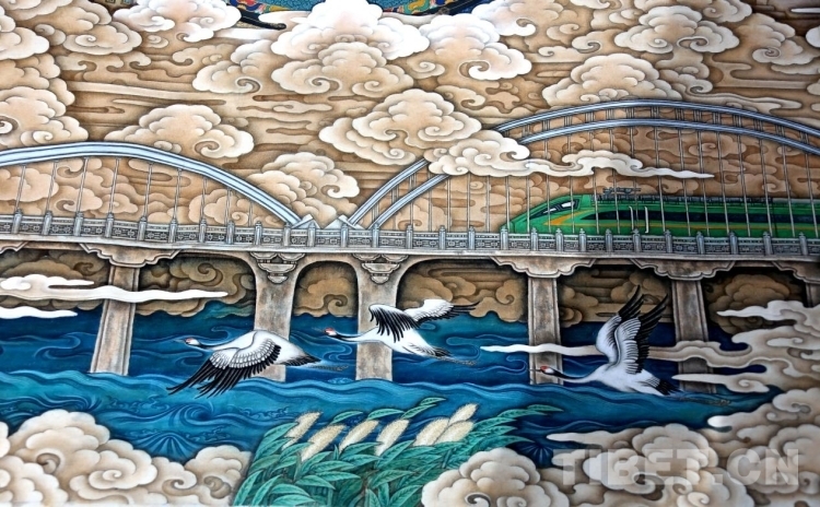 據(jù)介紹,自西藏和平解放以來,在黨和國家的政策扶持下,西藏的唐卡藝術(shù)得到了很好的傳承和發(fā)展,傳統(tǒng)唐卡的五大畫派在各自的創(chuàng)作領(lǐng)域都有很高的藝術(shù)成就,但是傳統(tǒng)唐卡的各大畫派集中創(chuàng)作的形式從未有過,用傳統(tǒng)唐卡描繪新西藏的盛世圖景更是空白。迫切地需要西藏本土的美術(shù)工作者擔(dān)起文化使命感,用民族美術(shù)的載體歌頌偉大的中華民族、歌頌我們所處的美好時(shí)代、歌頌來之不易的美好生活。大型唐卡壁畫《高原明珠》應(yīng)運(yùn)而生。