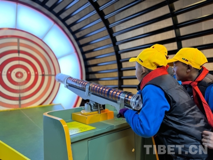 在講解員的帶領(lǐng)下學(xué)生們來到科技館,這里包括藏地智慧、科技樂園、科技前沿、體驗(yàn)世界屋脊等4個(gè)主題展區(qū),主要展示古老的西藏科技智慧、人類取得的科技成就及基礎(chǔ)科學(xué)知識(shí)、科技促進(jìn)人類的發(fā)展及西藏的開發(fā)建設(shè)、西藏高原生存環(huán)境的內(nèi)容。