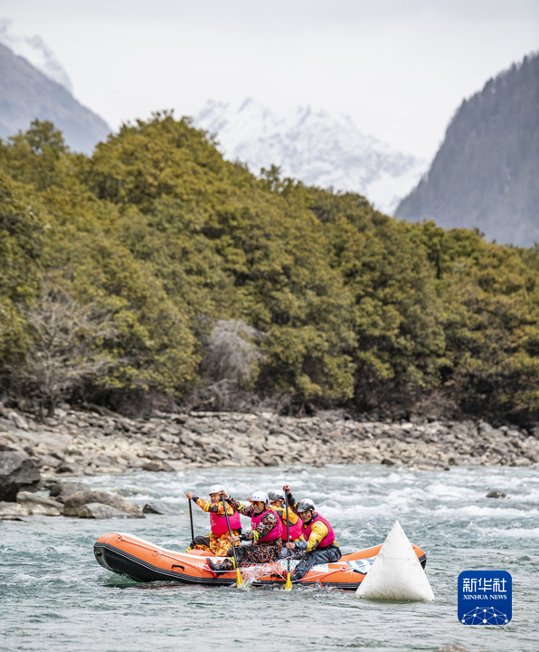 4月16日,“西藏旅游股份有限公司漂流隊”選手在激流漂流筏繞標賽中,他們最終獲得季軍(無人機照片)。新華社記者 孫非 攝
