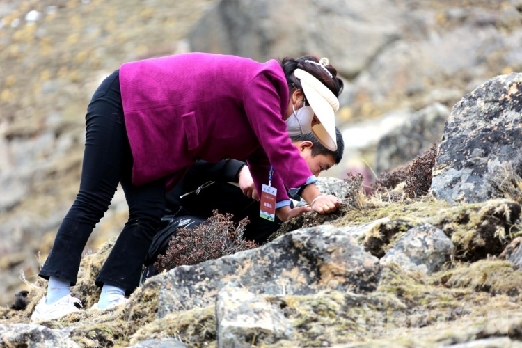 圖為游客在當(dāng)?shù)厝罕姷膸ьI(lǐng)下尋找蟲草 攝影:王佳豪