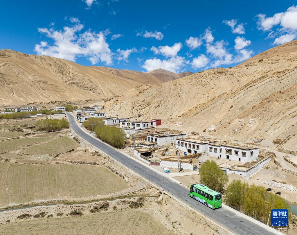 一輛載有游客的環(huán)保大巴車正駛向珠峰(5月25日攝,無人機照片)。新華社記者 孫非 攝