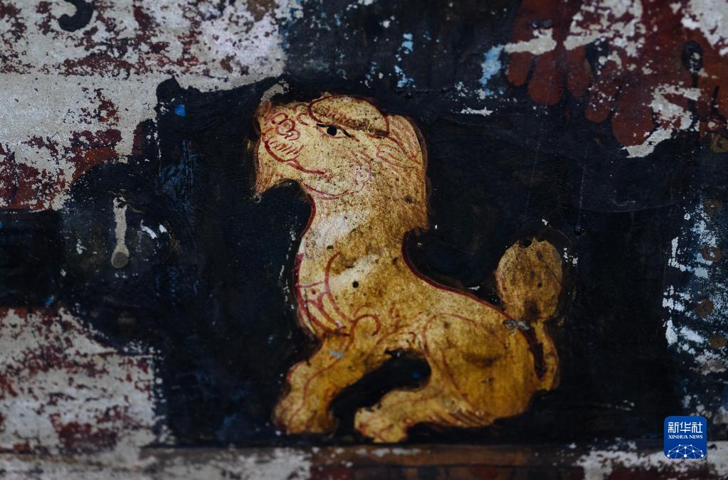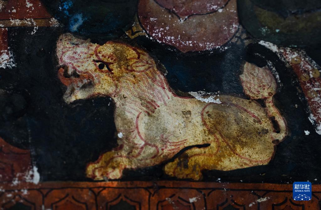 這是5月26日拍攝的皮央石窟壁畫中的獅子像。新華社記者 費(fèi)茂華 攝