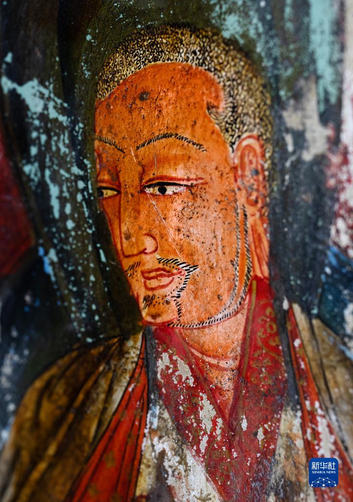 這是5月26日拍攝的皮央石窟壁畫中的長(zhǎng)胡子的人物造型。新華社記者 費(fèi)茂華 攝