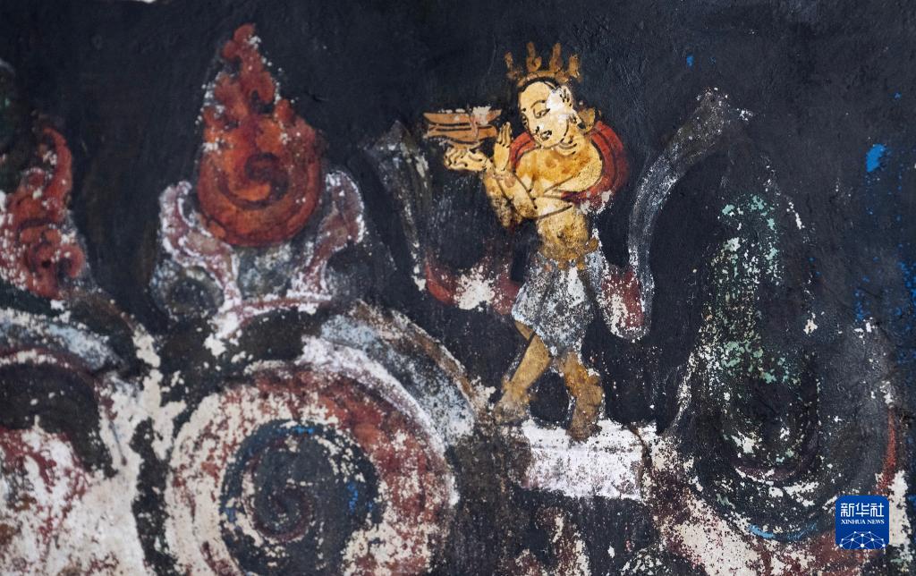 這是5月26日拍攝的皮央石窟壁畫中的長(zhǎng)翅膀的人物造型。新華社記者 費(fèi)茂華 攝