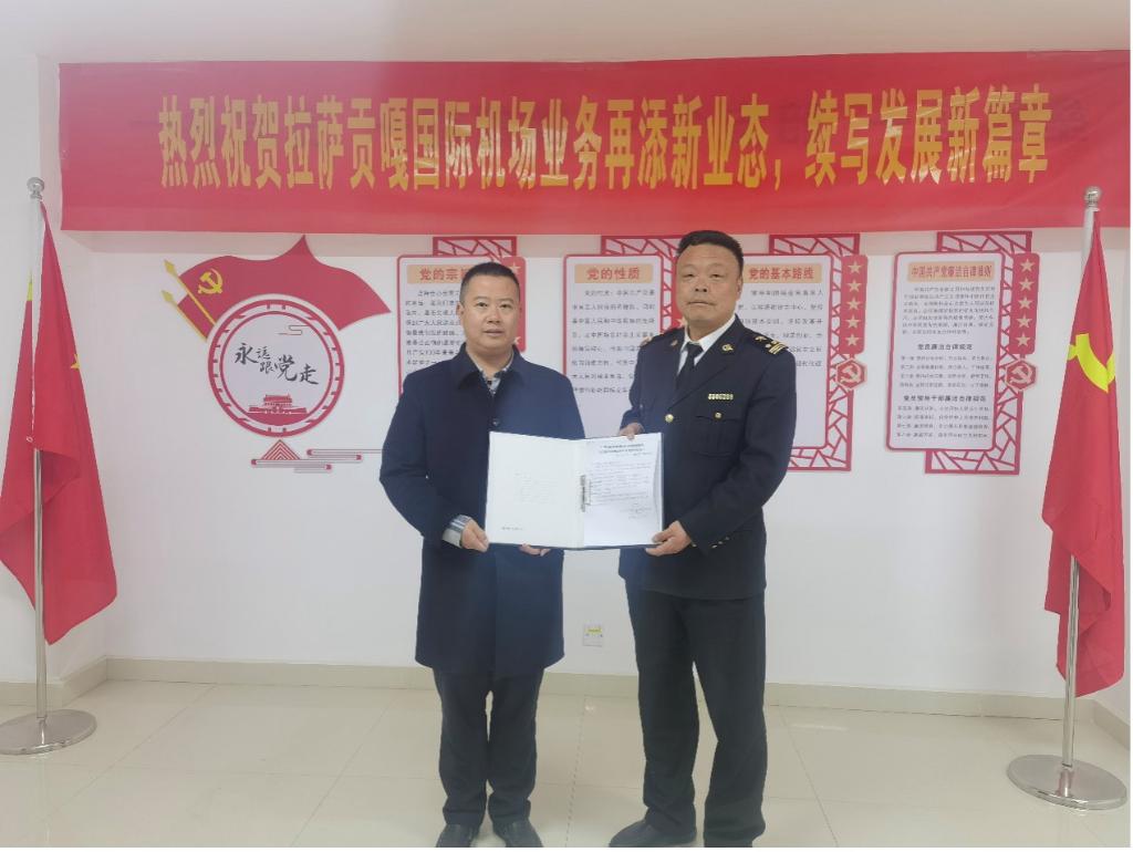 3日,拉薩海關負責人向西藏機場集團貨運部負責人頒發(fā)海關監(jiān)管貨物倉儲企業(yè)注冊登記證書。(拉薩海關供圖)