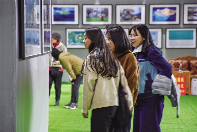 大學生在書畫展覽現(xiàn)場參觀。