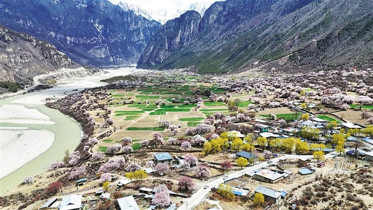 4月的那曲市嘉黎縣尼屋鄉(xiāng),春雪初融、桃花灼灼,村落、農(nóng)田與桃花融為一體,呈現(xiàn)出一派高原和美鄉(xiāng)村景象。 記者 趙書彬 攝