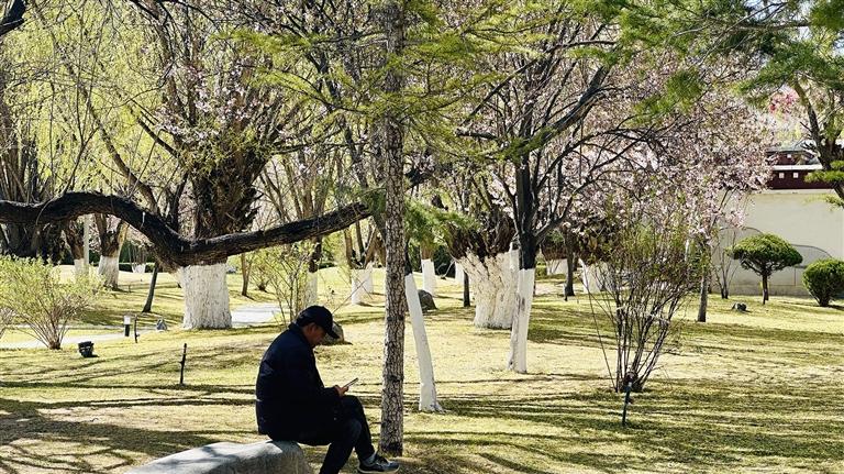 在拉薩,賞花從不必刻意尋找景區(qū),許多街道便藏著盎然春色。四月的拉薩城西,也有著令人目不暇接的美好。八一路、羅堆西路、羅布林卡路一帶,除了常見的榆葉梅、紫葉李等,還藏著拉薩不常見的海棠花,此時的海棠花在綠葉的襯托下開得正艷。陽光灑下,花朵和葉子的顏色飽和度極高,微風拂過,花瓣輕柔飄落,不少路人紛紛停下拍照,將明艷的春色收進自己的手機。