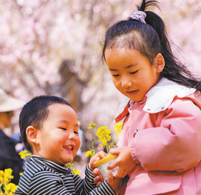 小朋友在桃樹下開心玩耍。圖為記者徐馭堯攝