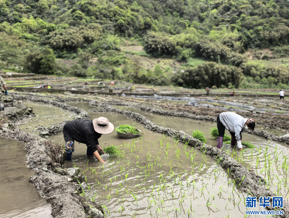 4月24日,墨脫縣背崩鄉(xiāng)地東村群眾在稻田里插秧。新華網(wǎng)發(fā) 趙東 攝