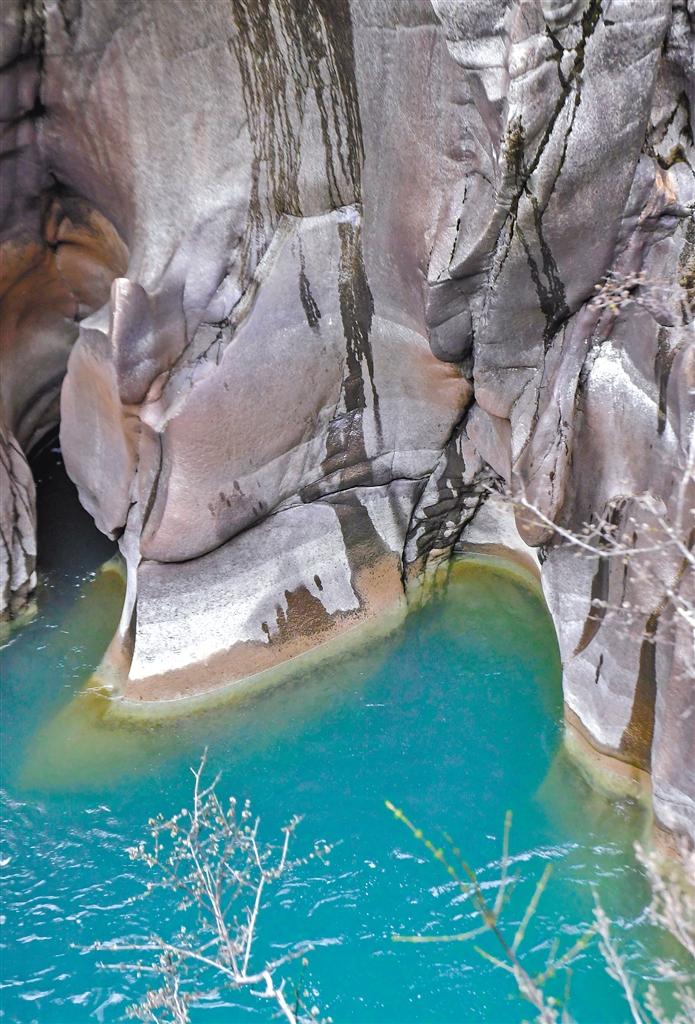 察隅縣千年水磨巖適合觀賞期在春、秋、冬三季的枯水期。此時水位下降、巖石露出,水色澄碧、怪石嶙峋,石頭似臥犀、似河馬、似龍爪、似漏斗、似波浪,形態(tài)多變,與森林、水流、高山懸崖相呼應(yīng),組合成難得一見的山水畫卷。