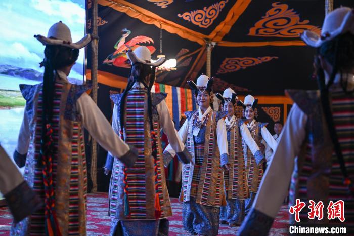 5月18日,西藏拉薩首屆“雪域古城·圣地拉薩”文化旅游節(jié)“情定當(dāng)雄”篝火鍋莊晚會(huì)在當(dāng)雄縣賽馬場(chǎng)熱鬧舉行。活動(dòng)開場(chǎng),當(dāng)雄縣盛大的迎賓儀式,盡顯藏族人民的熱情好客。隨后,拉薩各縣區(qū)帶來極具地方特色的文藝節(jié)目,舞蹈、歌曲等表演精彩紛呈,展現(xiàn)了拉薩多元文化魅力。傍晚,游客市民在賽馬場(chǎng)黑帳篷中觀看非遺展示,深入了解藏文化精髓。夜幕降臨,眾人圍在篝火旁跳起鍋莊,歡聲笑語回蕩在高原夜空。圖為當(dāng)雄牧民手持哈達(dá)參加迎賓儀式。中新社記者 貢嘎來松 攝