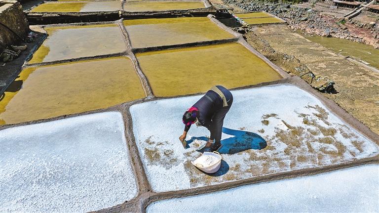 村民在鹽田收鹽。