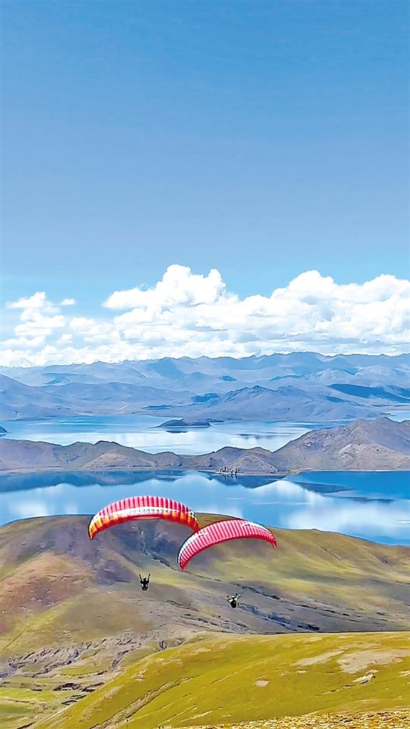 5月,午后的羊卓雍錯(以下簡稱羊湖)別具魅力。在海拔大約5000米的山頂上,經(jīng)過一番準(zhǔn)備,來自深圳的游客朱先生跟隨教練口令向懸崖邊沖去。滑翔傘被氣流托舉著騰空而起,劃出一道優(yōu)美的弧線,像雄鷹一樣翱翔在波光粼粼的湖面上,最后飄然降落在湖邊……