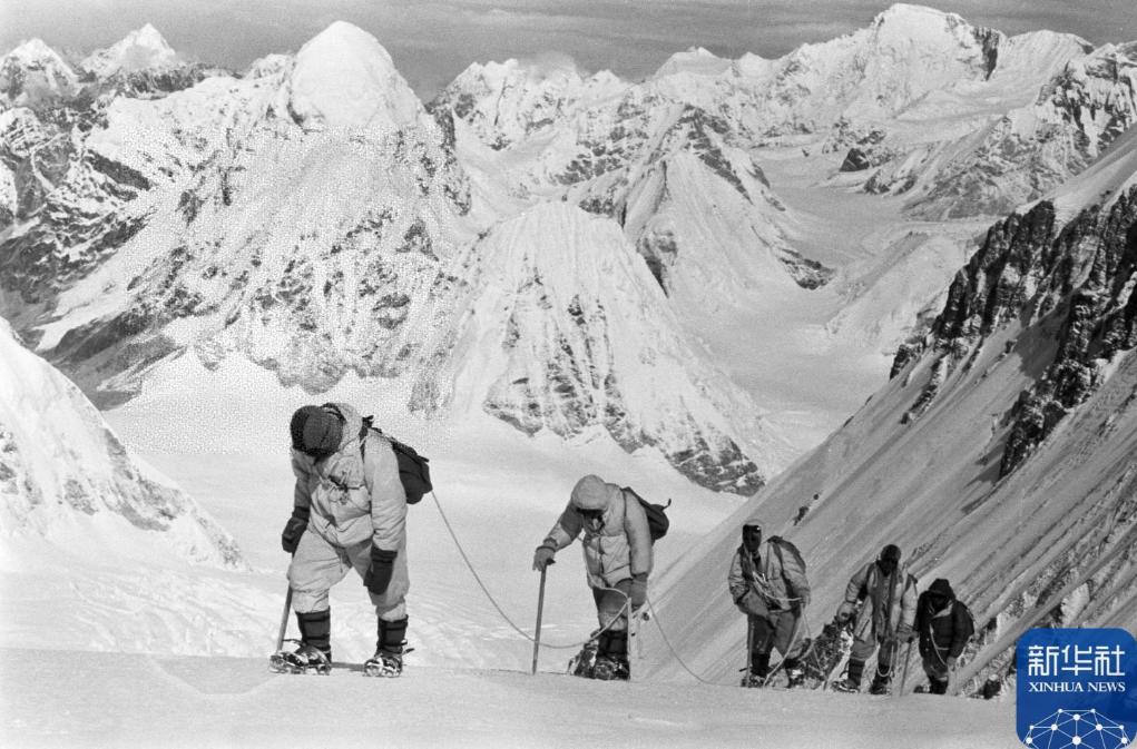1960年5月,中國登山隊(duì)隊(duì)員在海拔7150米的冰雪坡上行進(jìn)。新華社發(fā)(曾曙生 攝)