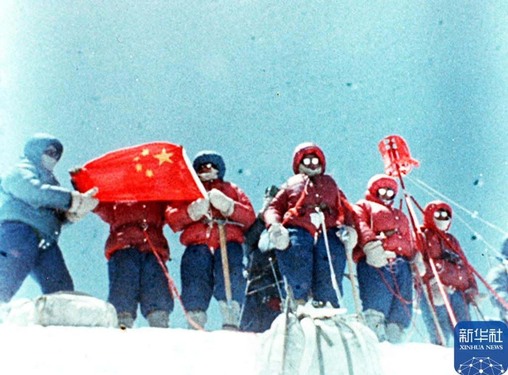 1975年5月27日,中國登山運(yùn)動(dòng)員索南羅布、羅則、侯生福、桑珠、大平措、貢嘎巴桑、次仁多吉、阿布飲、潘多從北坡登上珠峰。新華社發(fā)(侯生福 攝)