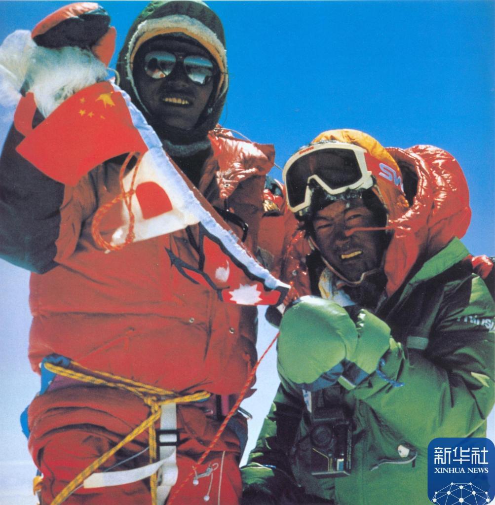 1988年5月5日,中國登山運(yùn)動(dòng)員登頂后展示中國、日本和尼泊爾三國國旗。新華社發(fā)