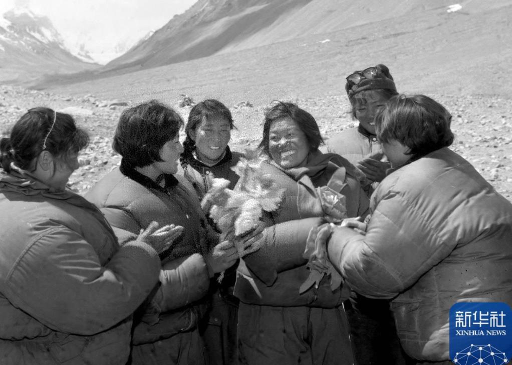 1975年5月,潘多(左四)成功登頂珠峰后,從珠峰返抵大本營。新華社發(fā)